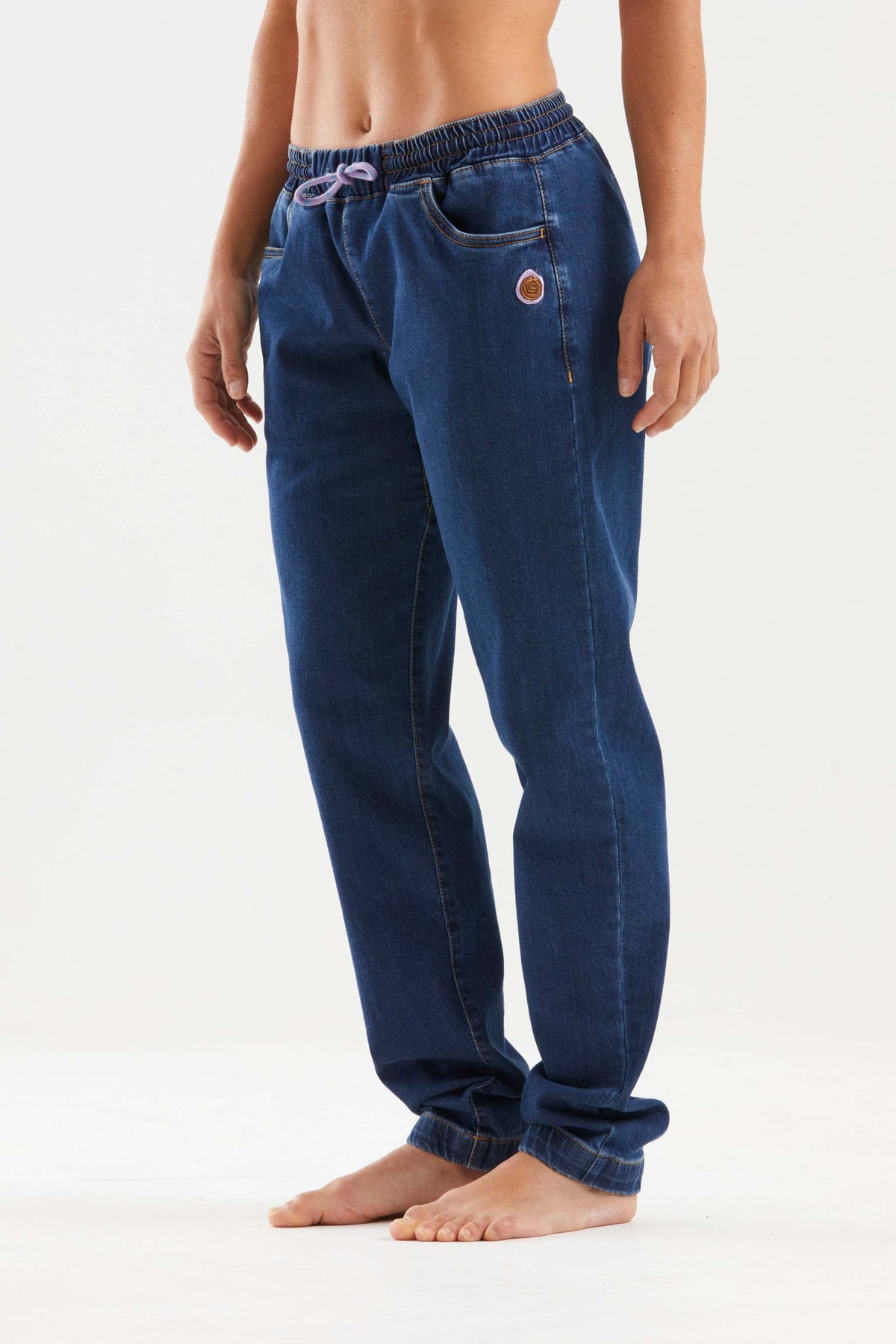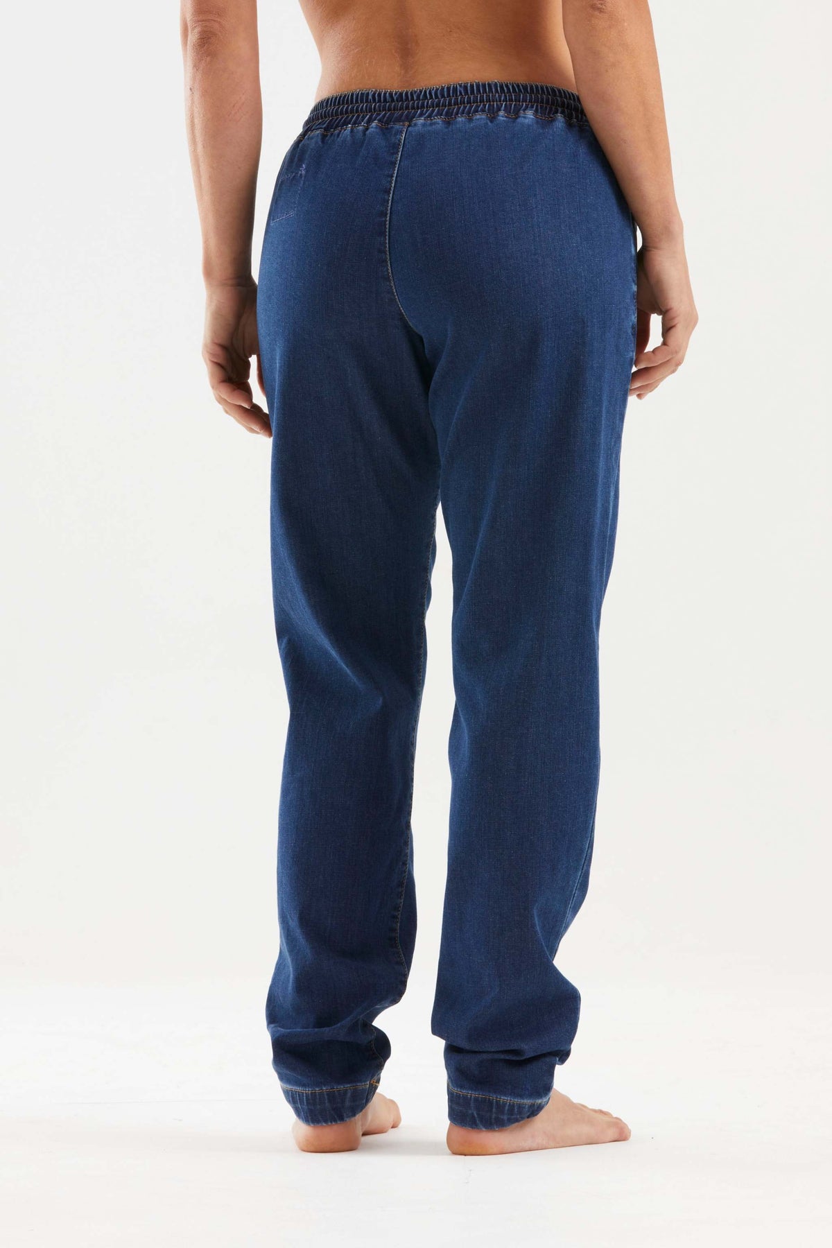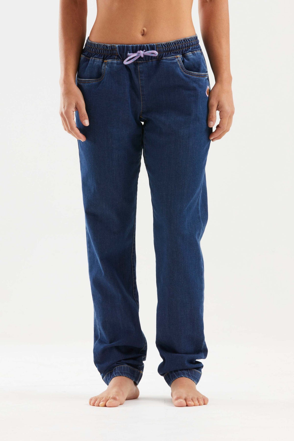 Pantaloni da arrampicata in velluto di cotone biologico, con tasche laterali in tessuto tecnico e patch logo sulla gamba destra. Variante colore blu.