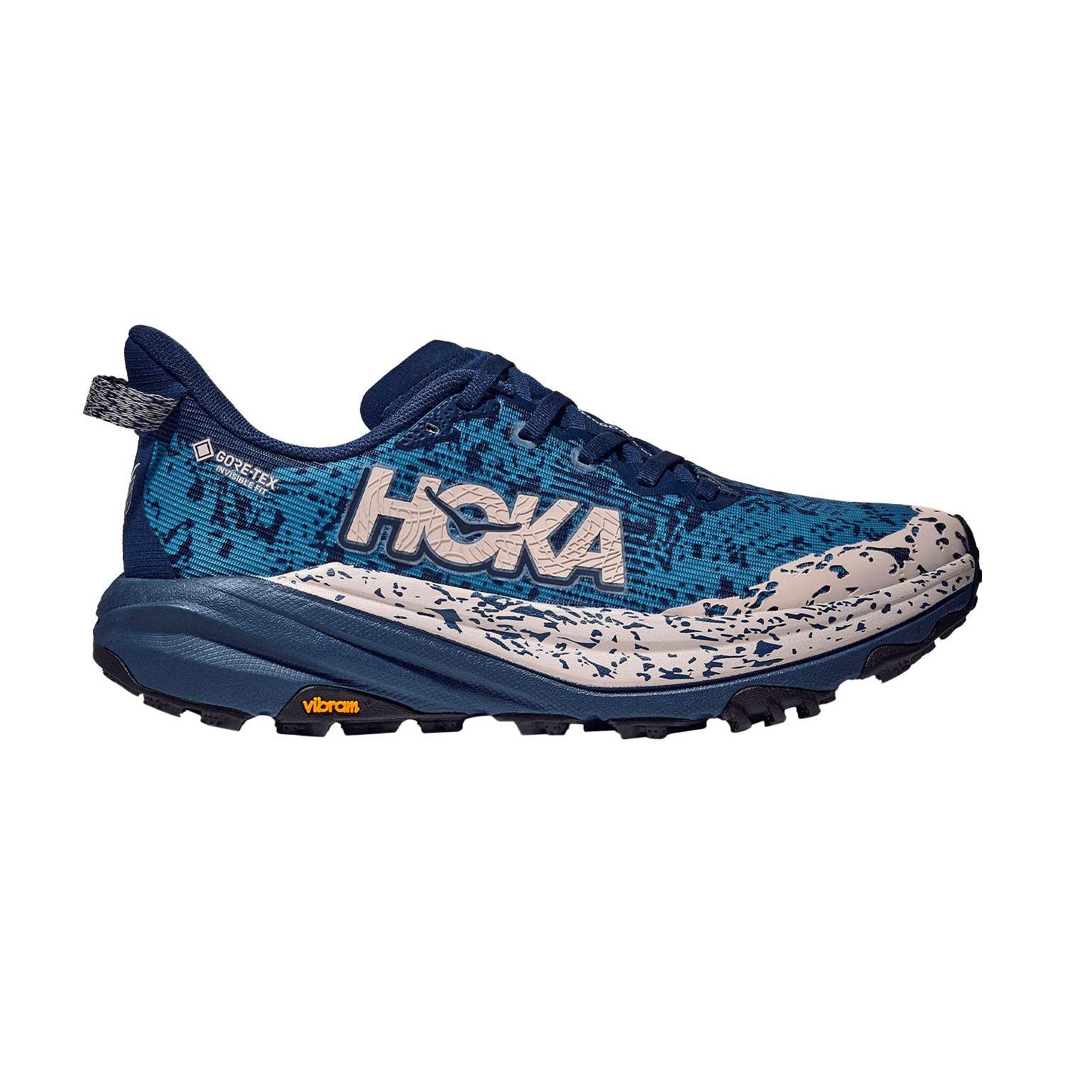 Trail shoe Hoka W Speedgoat 6 GTX, featuring GORE-TEX Invisible Fit and Vibram Megagrip sole for wet conditions.