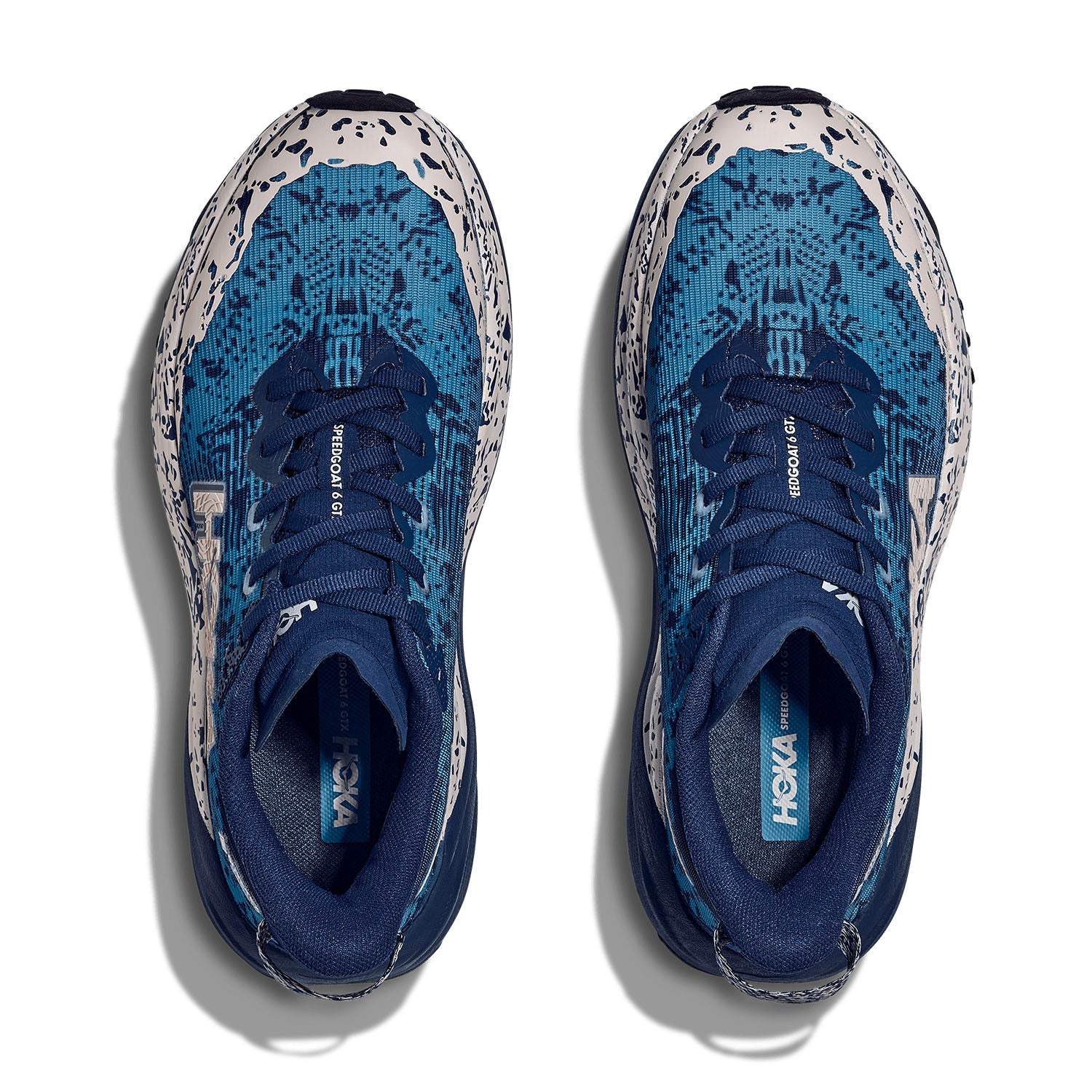 Trail running shoes, Speedgoat 6 GTX, featuring GORE-TEX Invisible Fit, Vibram Megagrip outsole, and reinforced heel in white and blue.