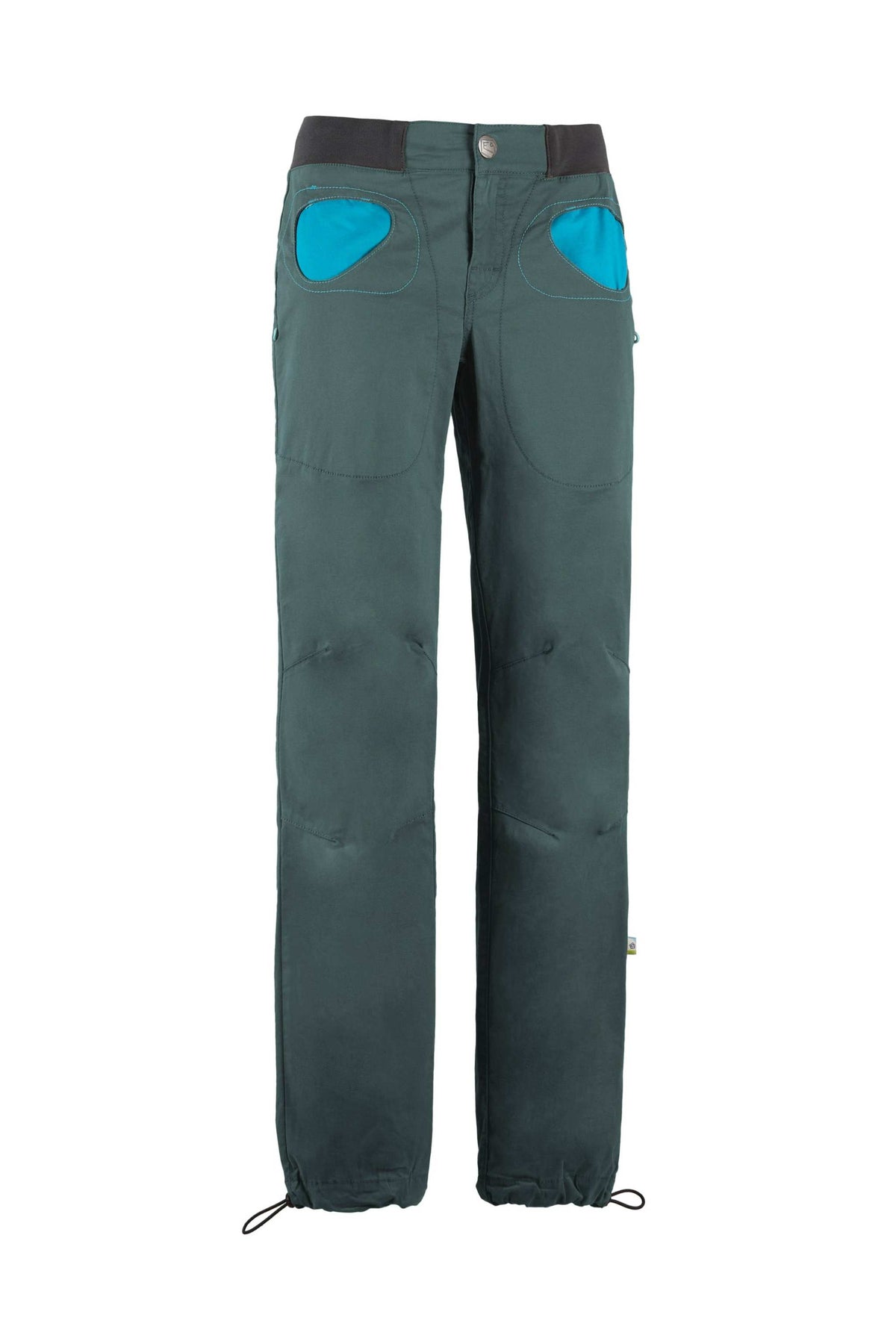 Outdoor and climbing trousers in stretch gabardine. Organic cotton. Pocket with contrasting color fabric. Adjustable leg bottom and waist. Brush holders on both side. Good comfort and mobility. Slim fit. Made in Italy.