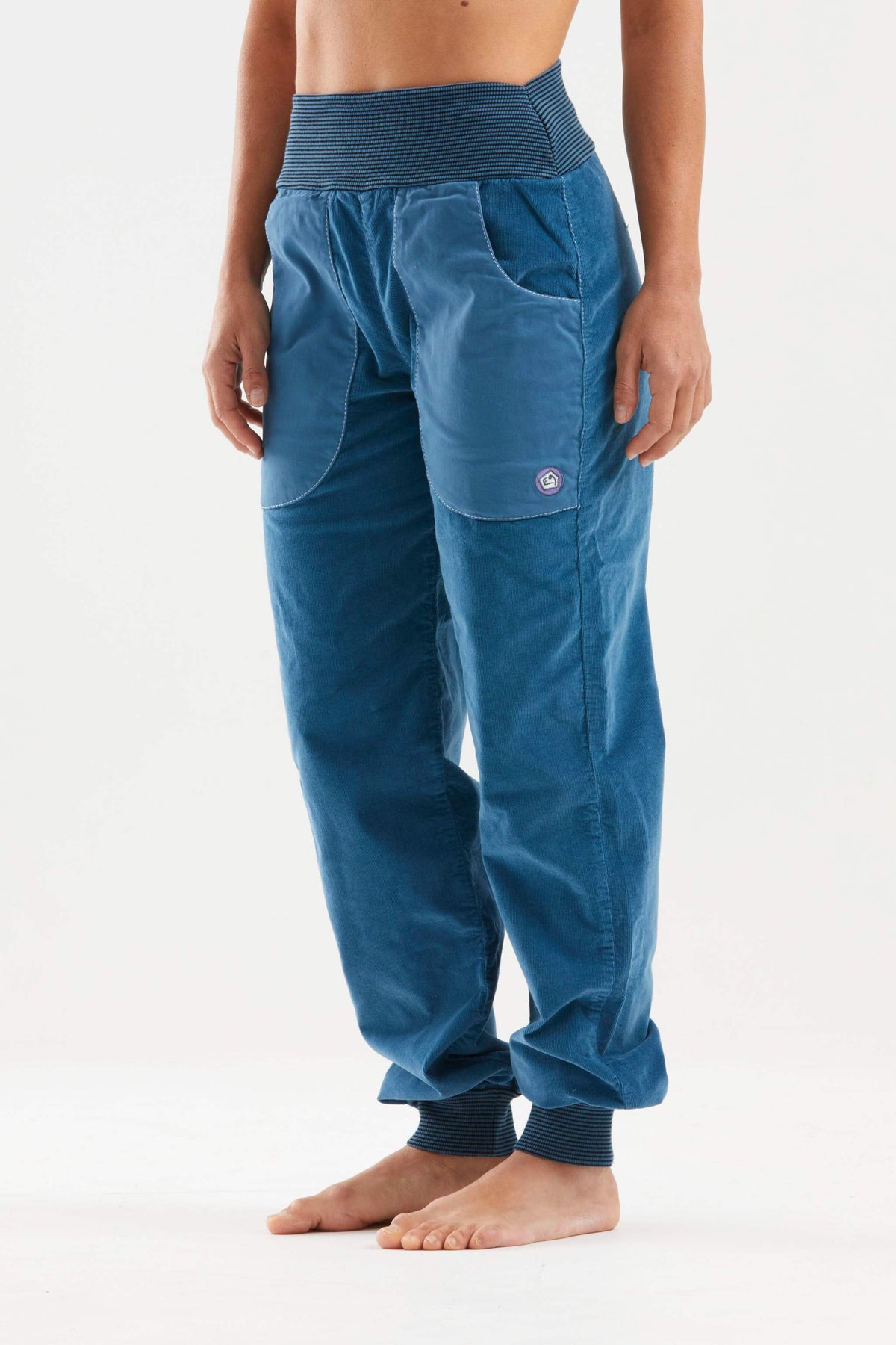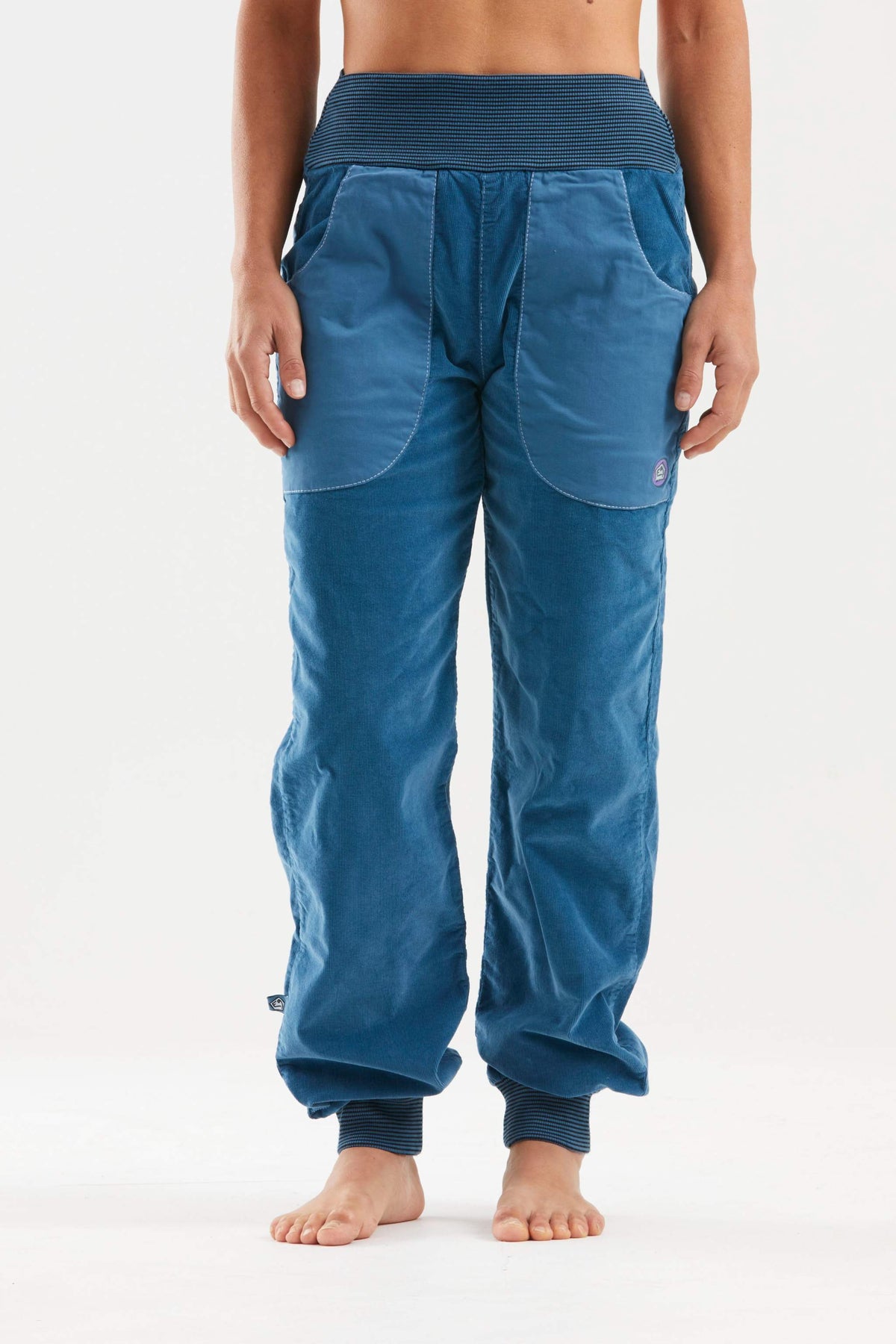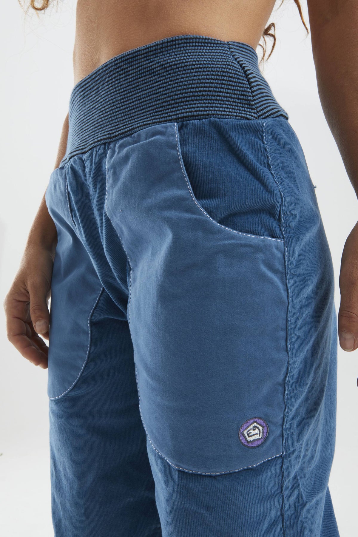 Pantaloni da outdoor e da arrampicata in velluto a coste di cotone biologico. Tasca frontale in tessuto satinato. Ricamo sulla tasca sinistra. Costina in vita e fondo gamba. Buon comfort e vestibilità rilassata.