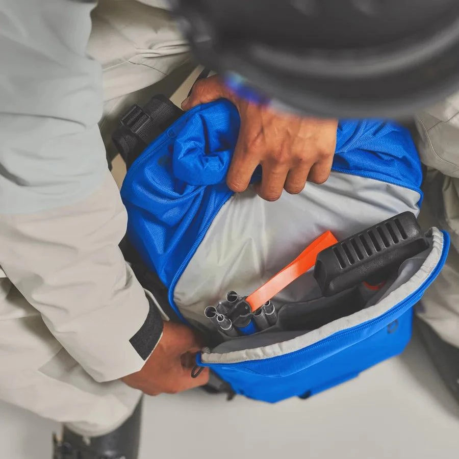 Lo zaino può essere rapidamente compresso grazie alle cinghie integrate sui lati, per ripiegarsi sul dorso come una seconda pelle, assicurando sempre la massima aderenza, anche in movimento. Per le discese in corda doppia nei solchi fluviali o nei brevi tratti a piedi, lo zaino freeride dispone di tutte le opzioni di fissaggio necessarie per gli sci, la picozza o la corda, oltre alla collaudata rete di fissaggio casco, al cartellino d’emergenza, e al supporto per il sistema di idratazione. Tutte le funzionalità sono accessibili dall'esterno in modo da non rimanere mai bloccati, anche su terreni accidentati.